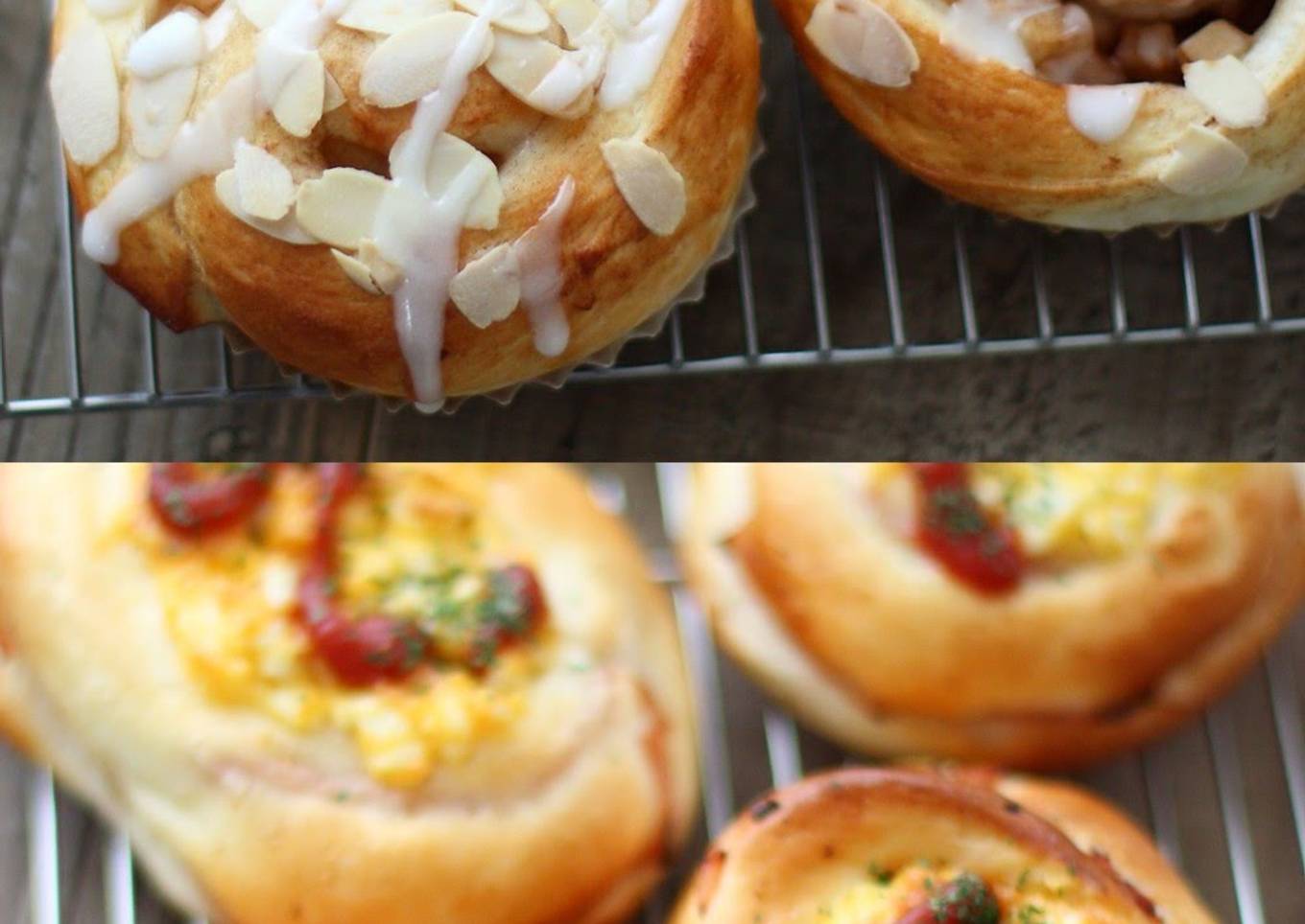 - The ones in the front are ham, corn and mayo bread, and ham, corn, mayo, and cheese bread. The ones in the back are wiener sausage rolls topped with ketchup and whole grain mustard.