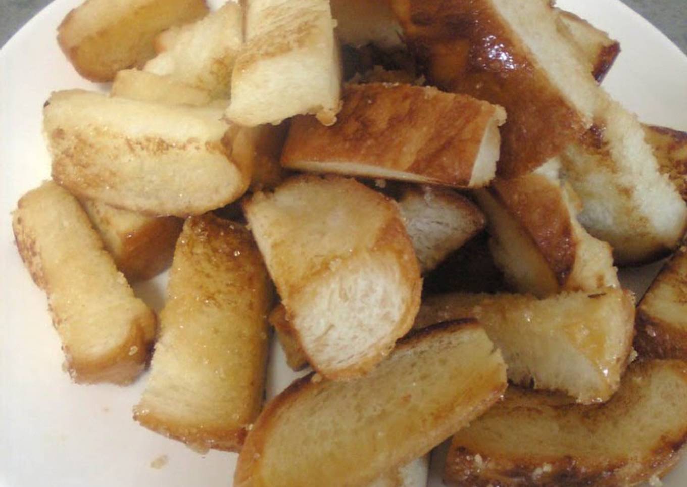 - Melt the butter in a warm frying pan, then add the bread and fry. The butter is easily absorbed by the bread, so stir together quickly. Fry 1-2 minutes until both sides are crispy, then sprinkle on the sugar and mix. It's done when the sugar turns a nice golden brown.