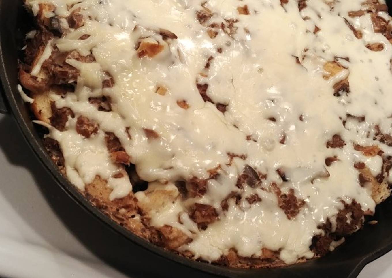 - Later..... I pull skillet out of fridge, top with cheese, cover with foil, and heat on the stove top over a medium low heat... While trying to get my kids to shower and put away their sports gear and I try to find my cork screw and wine (which strangely enough I remembered without a grocery list....) Hmmmm.....