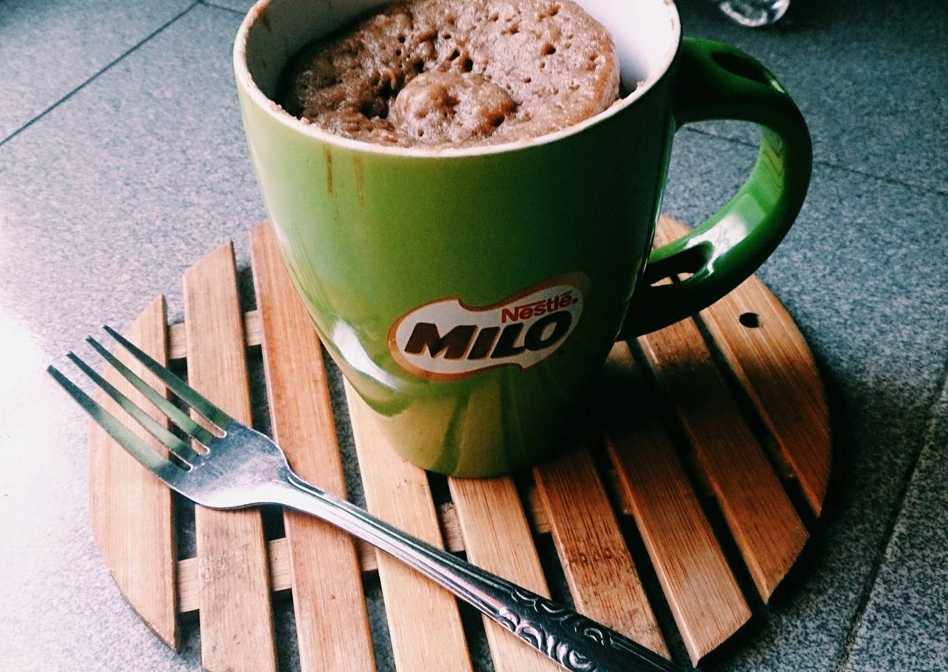 - Mix flour, Milo, sugar, baking powder, baking soda in a microwave-safe mug
