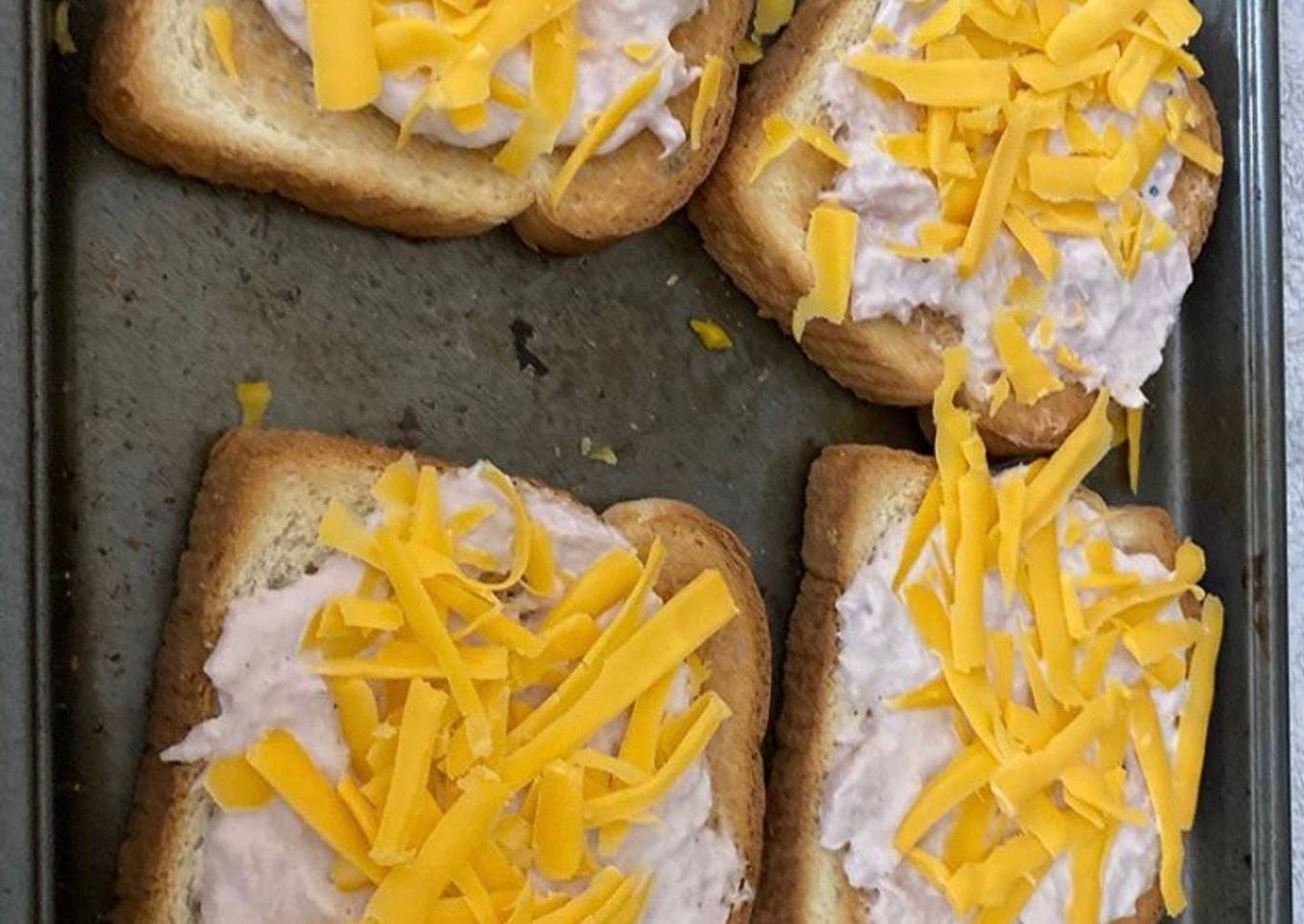 - Please the toasted bread on a baking sheet divide the tuna mixture evenly among each slice spreading to the edges of each piece covering the tuna mixture with 1/4 cup cheddar cheese on each piece