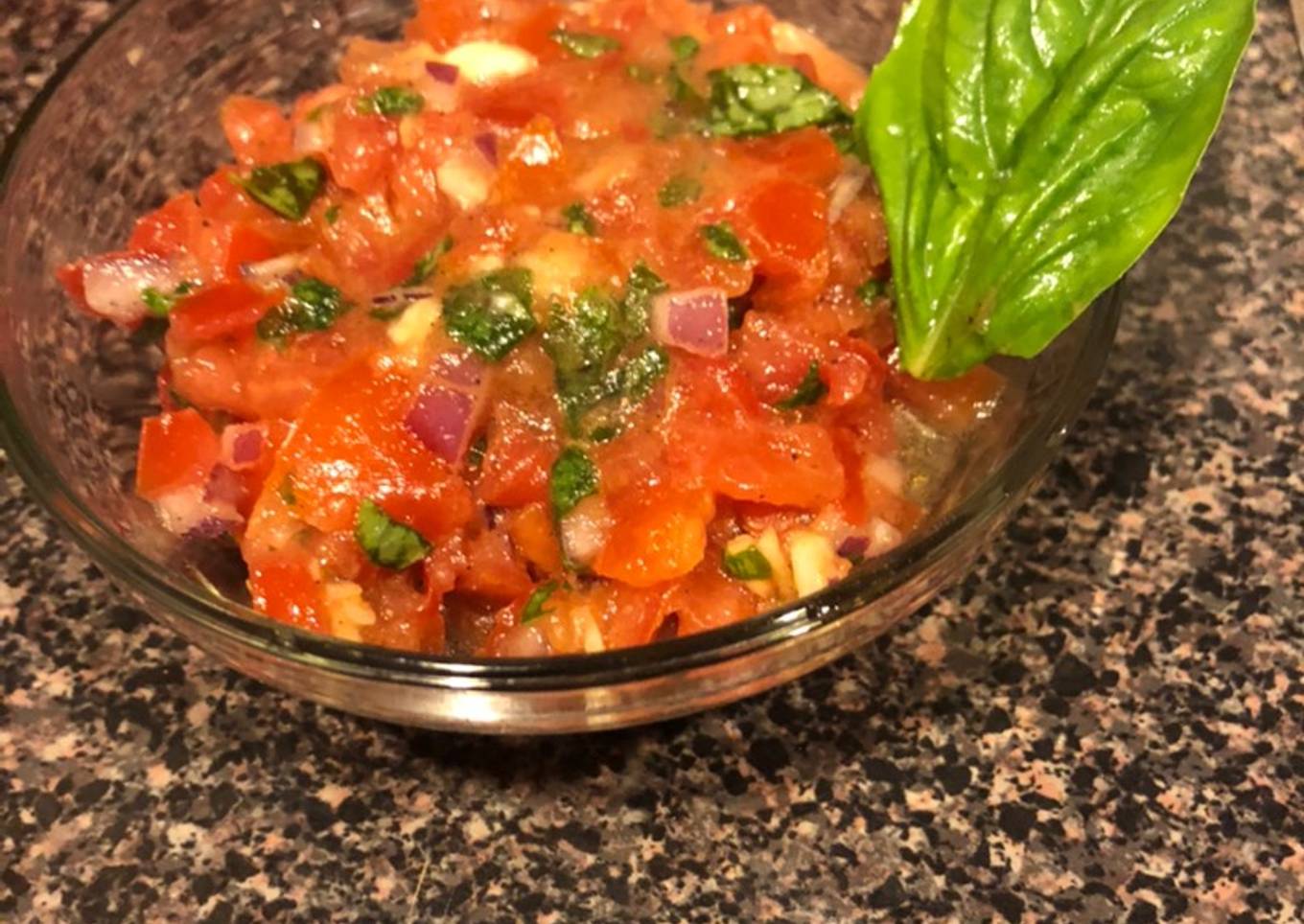 - Take the tomatoes, onions, basil and garlic and put in a bowl. Put a drizzle of olive oil, the red wine vinegar, salt and pepper and mix well.