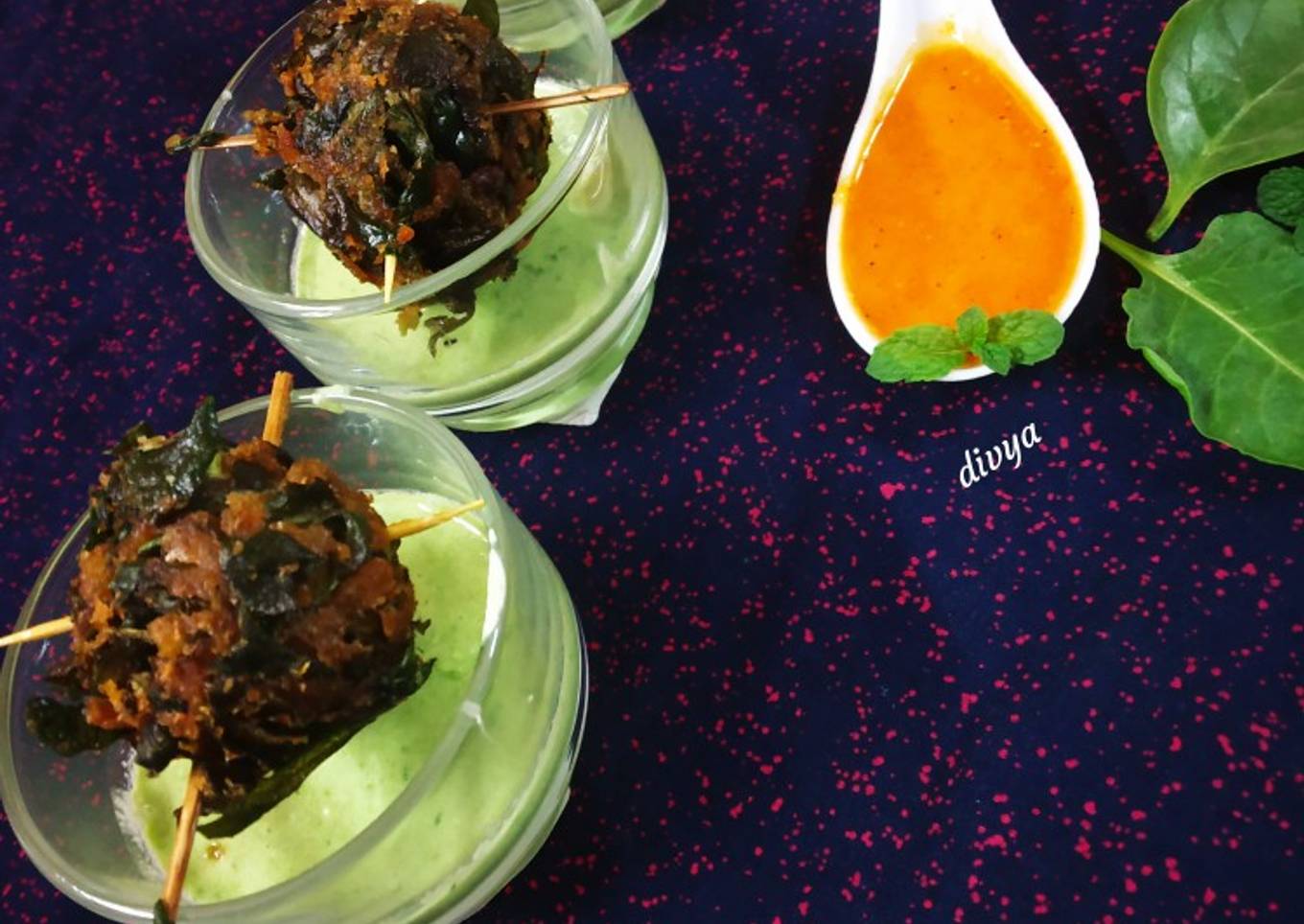- Take serving glasses pour mint chutney arrange palak panner balls with sticks ready to serve