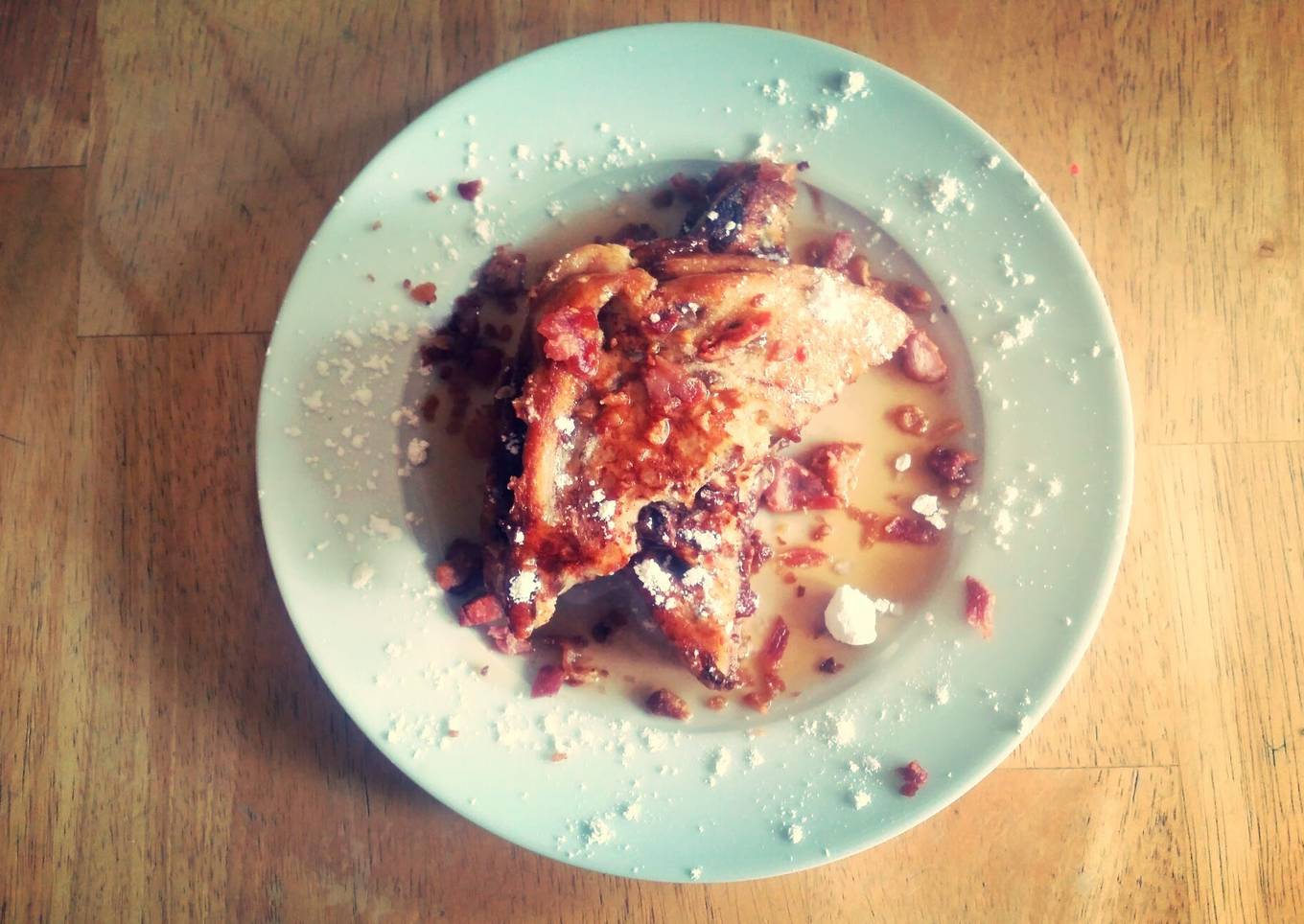 - Serve with maple syrup and powder sugar and any leftover bacon pieces you have!
