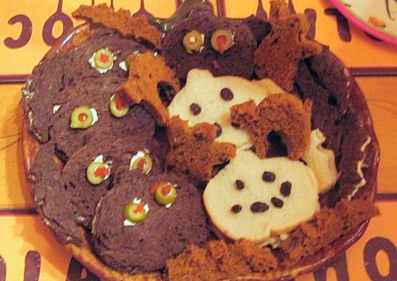 - Slice 4 pimento-stuffed olives in half and use small dabs of cream cheese to attach them to the sandwiches to make eyes.