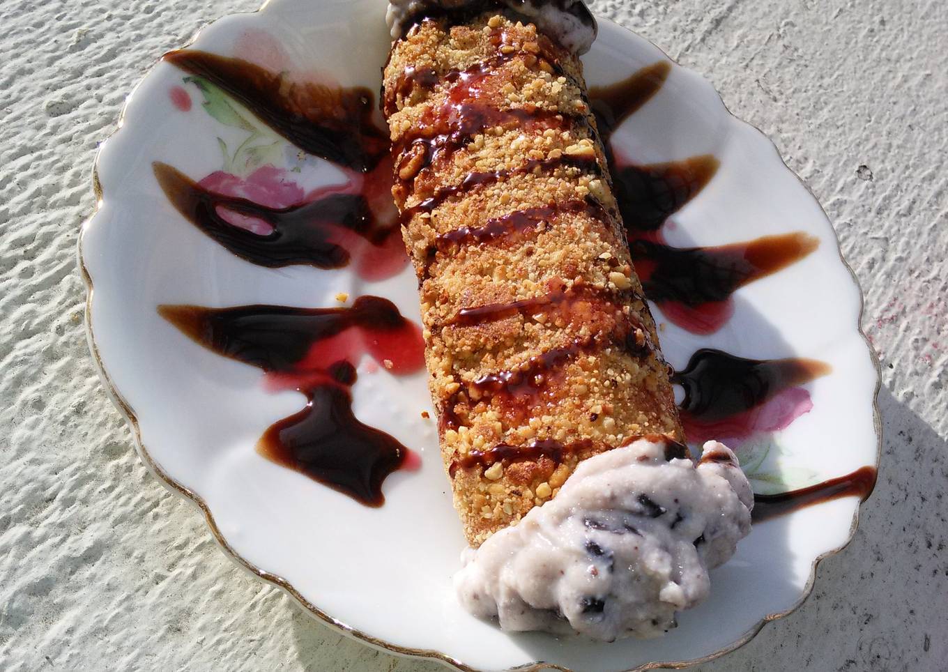 - Pipe extra ricotta mixture on sides to mimic a classic canoli and drizzle with chocolate and blueberry syrup
