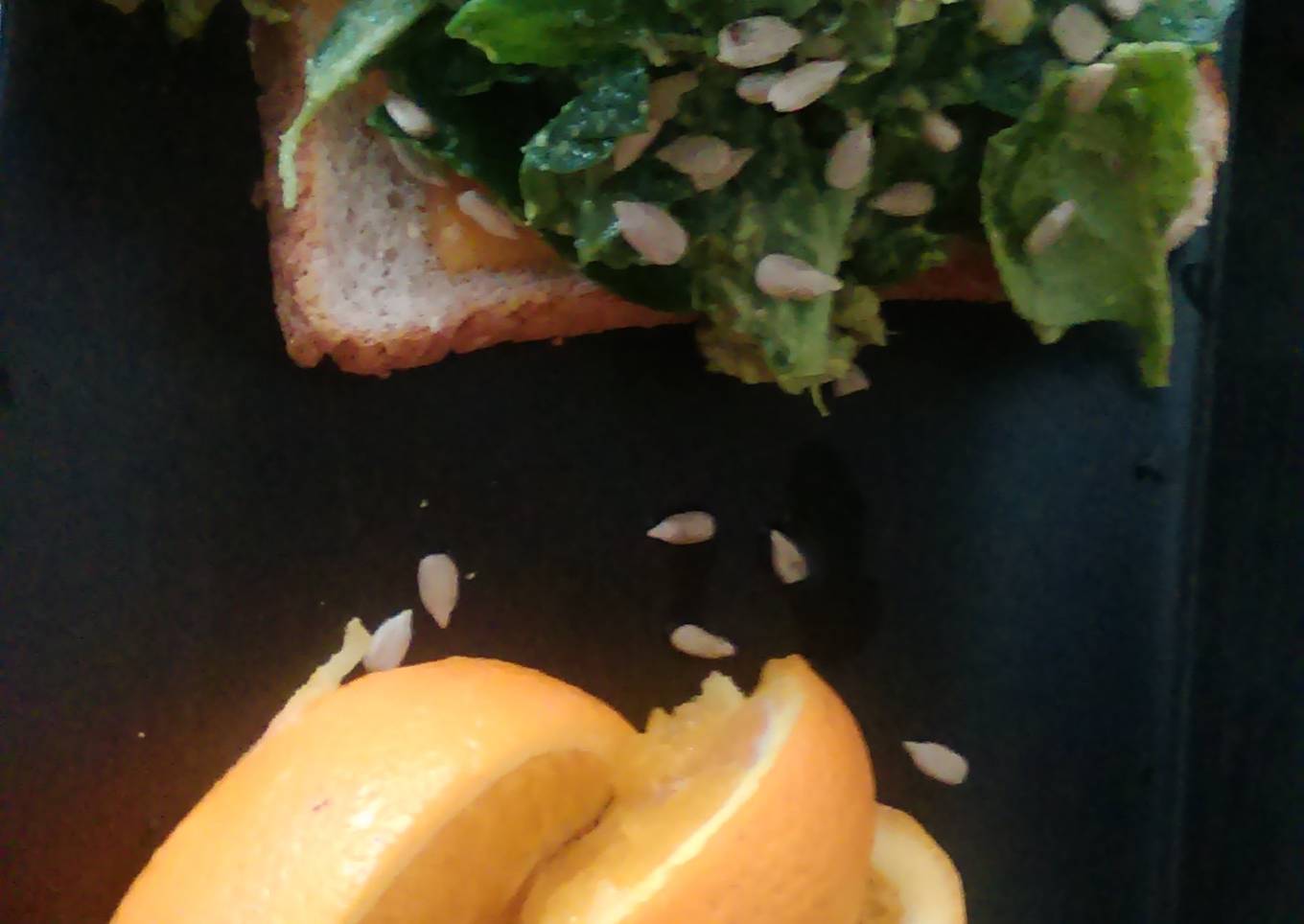 - Top the cheese slice with the avocado and spinach mix and sprinkle with seeds.